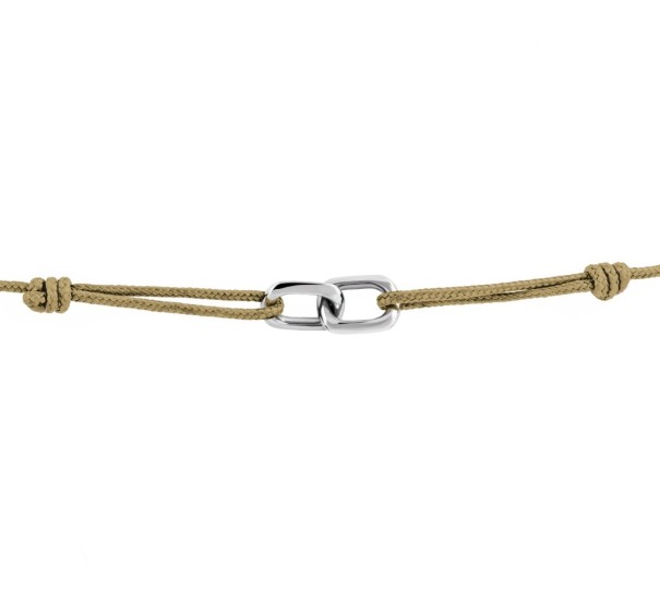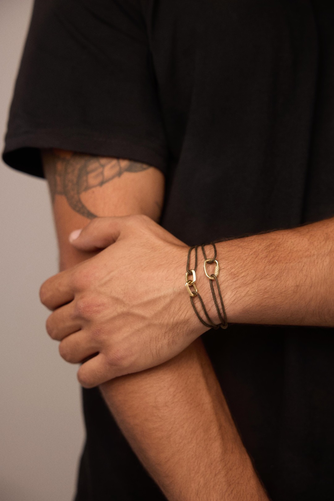 The Bond Bracelet is crafted from durable recycled material cord, fusing eco-conscious design with a strong, masculine aesthetic. Two golden interconnecting loops symbolize strength and unity, adding a bold yet elegant touch to the piece. Ideal for those who embrace sustainable fashion with a contemporary edge, this bracelet is a versatile accessory that blends ruggedness with sophistication. Available in 8 different cord colors, you can match it with your preferred gold accents. Personalize the bracelet with your chosen engraving, limited to 10 letters.