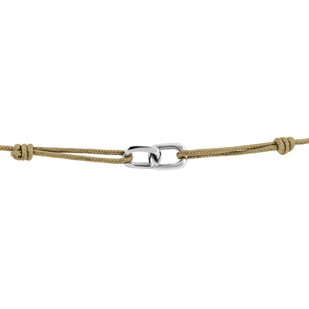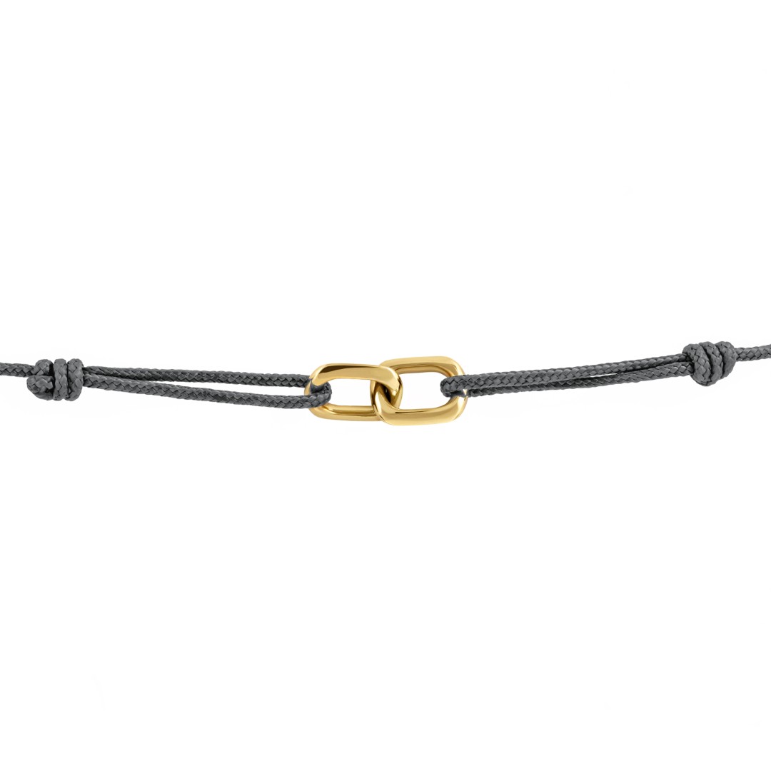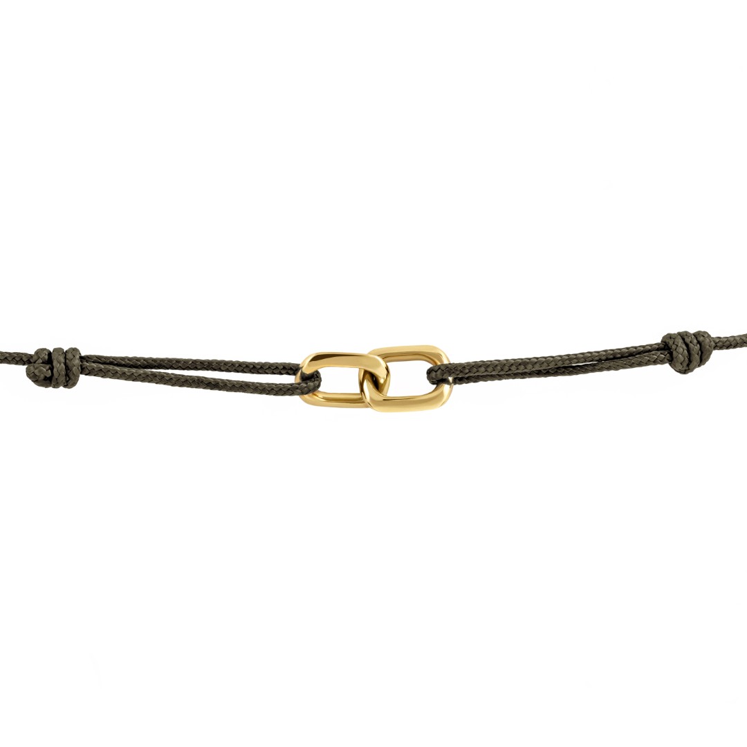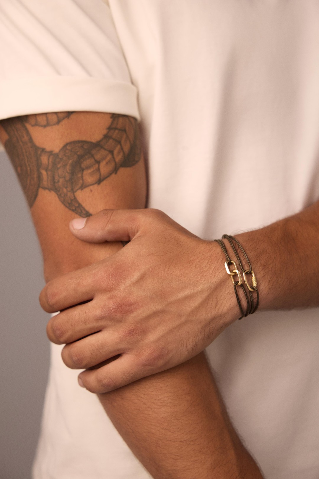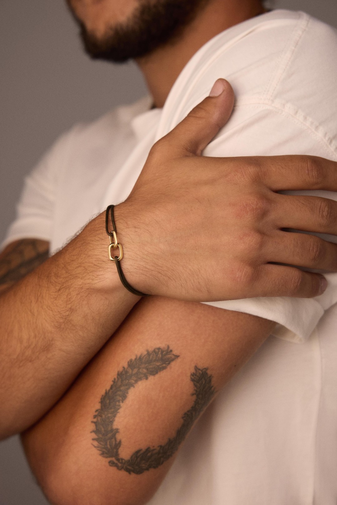 The Bond Bracelet is crafted from durable recycled material cord, fusing eco-conscious design with a strong, masculine aesthetic. Two golden interconnecting loops symbolize strength and unity, adding a bold yet elegant touch to the piece. Ideal for those who embrace sustainable fashion with a contemporary edge, this bracelet is a versatile accessory that blends ruggedness with sophistication. Available in 8 different cord colors, you can match it with your preferred gold accents. Personalize the bracelet with your chosen engraving, limited to 10 letters.